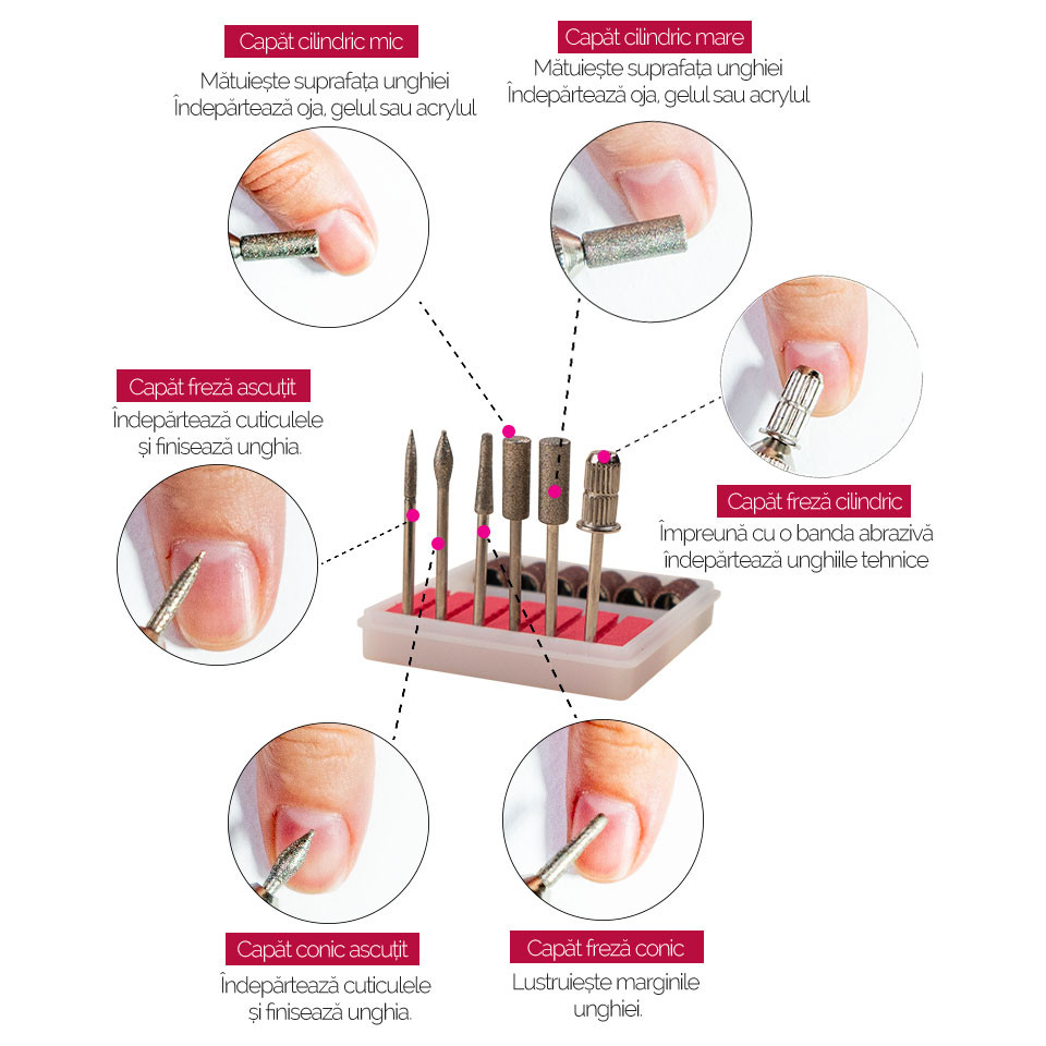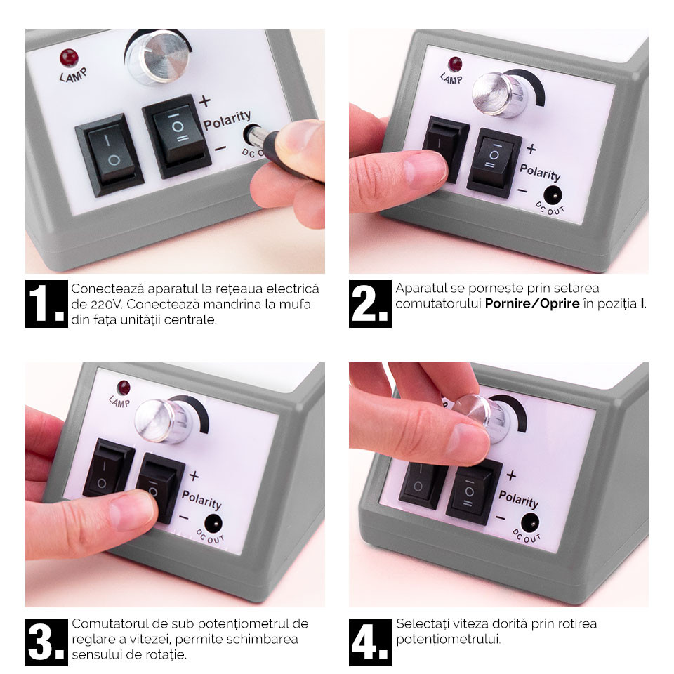 Freza Unghii Profesionala Star Nails SensoPRO Milano 20000 RPM, Gri pentru o eficienta marita pentru manichiura! Unitatea centrala contine regulatoare pentru turatie si sens de rotatie. Freza are mecanism de prindere cu diametrul de 2,4 mm cu fixare prin autoblocare, pentru schimbarea rapida a capetelor de lucru. Include un set de varfuri de lucru si cilindri abrazivi. Sfaturi utile pentru o folosire indelungata: Cand freza nu este folosita, aveti grija ca aceasta sa fie oprita de la butornul OFF. Nu este suficient ca modul de lucru sa fie dat la 0. Pentru fiecare schimbare a sensului de rotatie setati mai intai viteza de rotatie la 0 apoi apasati butonul de Reverse / Forward. Nu apasati butonul de Reverse / Forward in timpul functionarii. Exista riscul ca mandrina sa se arda. Specificatii tehnice: Viteza: 20.000 RPM Putere: 10 W Tensiune alimentare: 220-240 V 50Hz Culoare: Gri Model: SP-1520SN Material: Metal & HQ Plastic Dimensiuni: 13.5 x 8.5 x 6 cm Greutate: 780 g Sens rotatie FWD / REV Garantie: 12 luni Pachetul contine: Freza electrica profesionala manichiura Suport mandrina 6 inele abrazive 6 capete freza (modele diferite) Instructiuni de folosire
