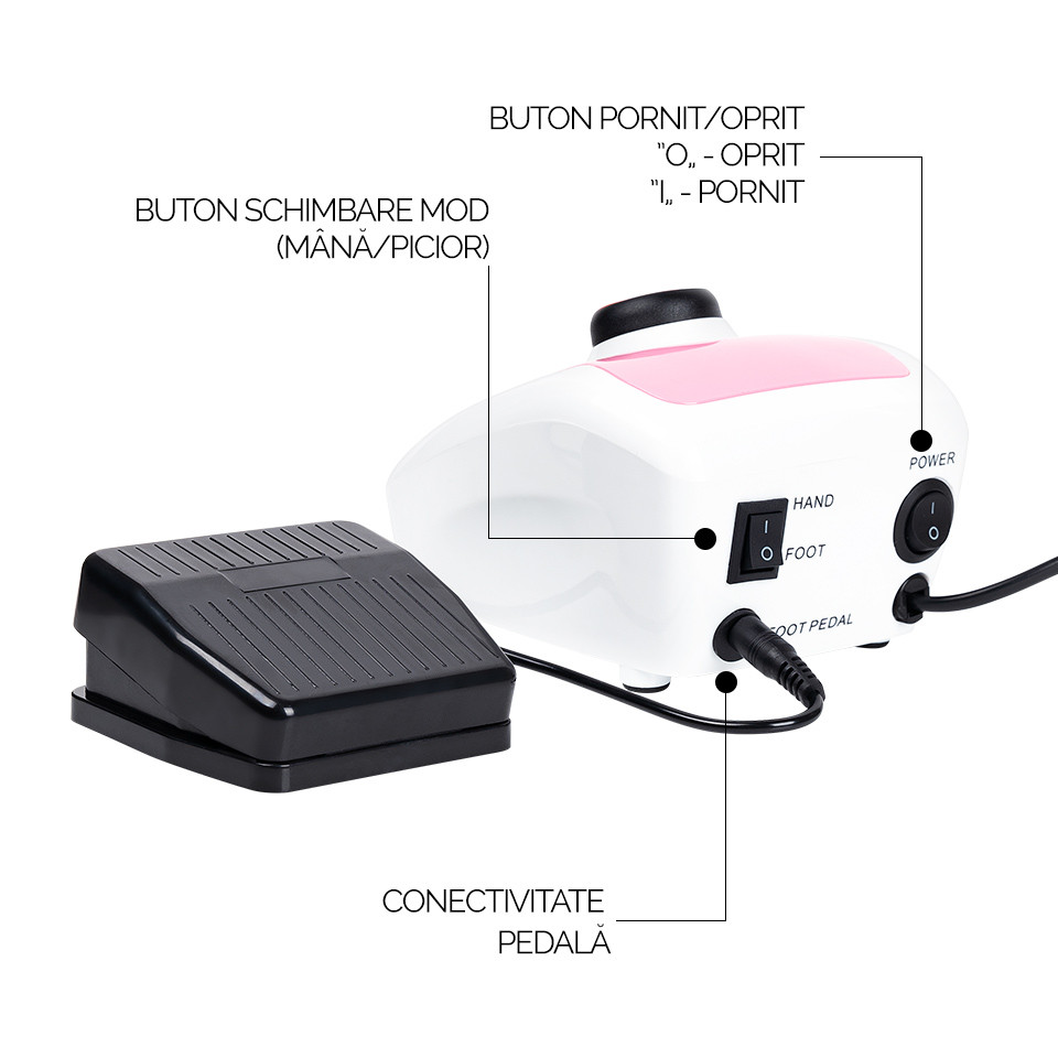 Freza unghii profesionala Turbo Bee 35.000 RPM – SensoPRO Milano, Pink este un dispozitiv cu multiple intrebuintari, pentru realizarea unor manichiuri / pedichiuri perfecte. Freza este recomandata pentru pilire, slefuire, polizare, ascutire, lustruire si definire a patului unghial, micsorand timpul de lucru si marind eficienta.Unitatea centrala are un design modern si este creata din materiale de calitate. Dispune de sistem de control al vitezei, protectie la suprasarcina si oprire de siguranta. Poate fi actionata atat manual, cat si cu ajutorul pedalei incluse, pentru un mai mare confort in utilizare. Dispozitivul ajunge la o viteza de pana la 35.000 rotatii pe minut si comutator avansat de directie (doua sensuri de rotatie), fiind adecvata atat dreptacilor, cat si stangacilor. Mandrina sa nu vibreaza in timpul utilizarii, este robusta, are greutate optima si varful subtire ce favorizeaza finetea si precizia operarii. Capul de slefuit poate fi inlocuit fara efort. Sfaturi utile pentru o folosire indelungata: Cand freza nu este folosita, aveti grija ca aceasta sa fie oprita de la butonul OFF. Nu este suficient ca modul de lucru sa fie dat la 0. Pentru fiecare schimbare a sensului de rotatie setati mai intai viteza de rotatie la 0 apoi apasati butonul de Reverse / Forward. Nu apasati butonul de Reverse / Forward in timpul functionarii. Exista riscul ca mandrina sa se arda. Conectarea mandrinei la freza se face prin cablul acesteia dotat cu 5 pini. Cablul de alimentare nu este detasabil. Specificatii tehnice: Viteza: 35.000 RPM Putere: 35W Tensiune alimentare: 220-240 V 50Hz Culoare: Pink Model: SP-3500PRO Material: Metal & HQ Plastic Dimensiuni: 14.5 x 11.5 x 8 cm Greutate: 1500 g Sens rotatie FWD / REV Garantie: 12 luni Pachetul contine: 1 buc x Pila electrica pentru unghii 1 buc x Mandrina 6 buc x Varfuri de polizare 6 buc x Capete de slefuit 1 buc x Pedala 1 buc x Manual de utilizare