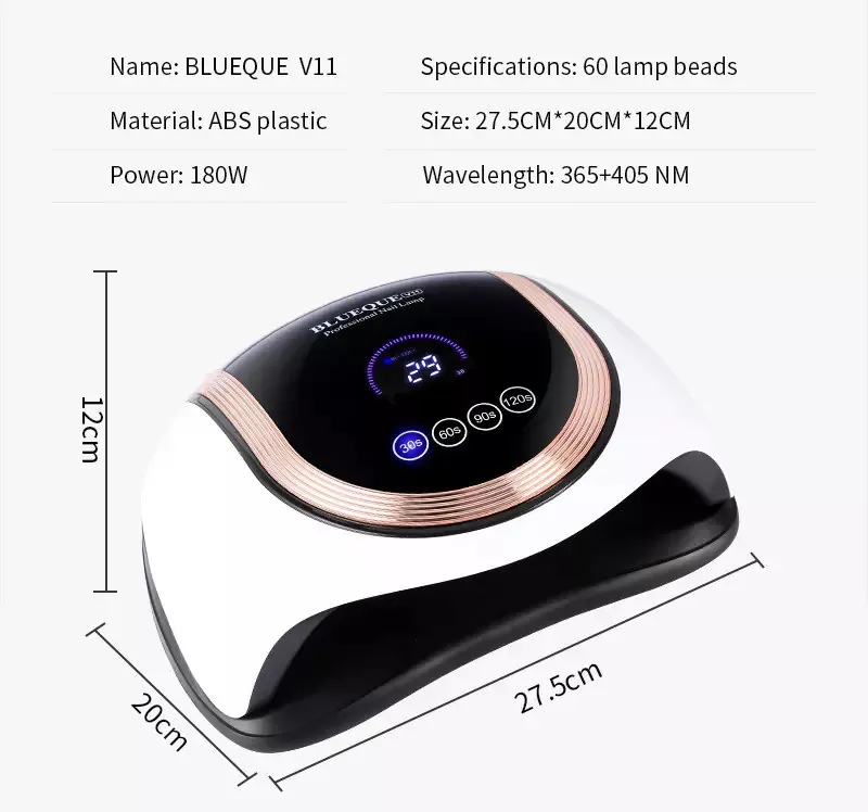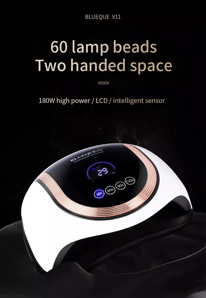 Lampa LED Unghii 2 in 1 Blueque V11 180W este un dispozitiv profesional de înaltă performanță, care vă permite să vă creați propriile unghii perfecte, fie acasă, fie la salon. Cu o putere de 180W și un design inovator, această lampă vă oferă o uscare rapidă și uniformă a gelului de unghii, în doar 30 de secunde.