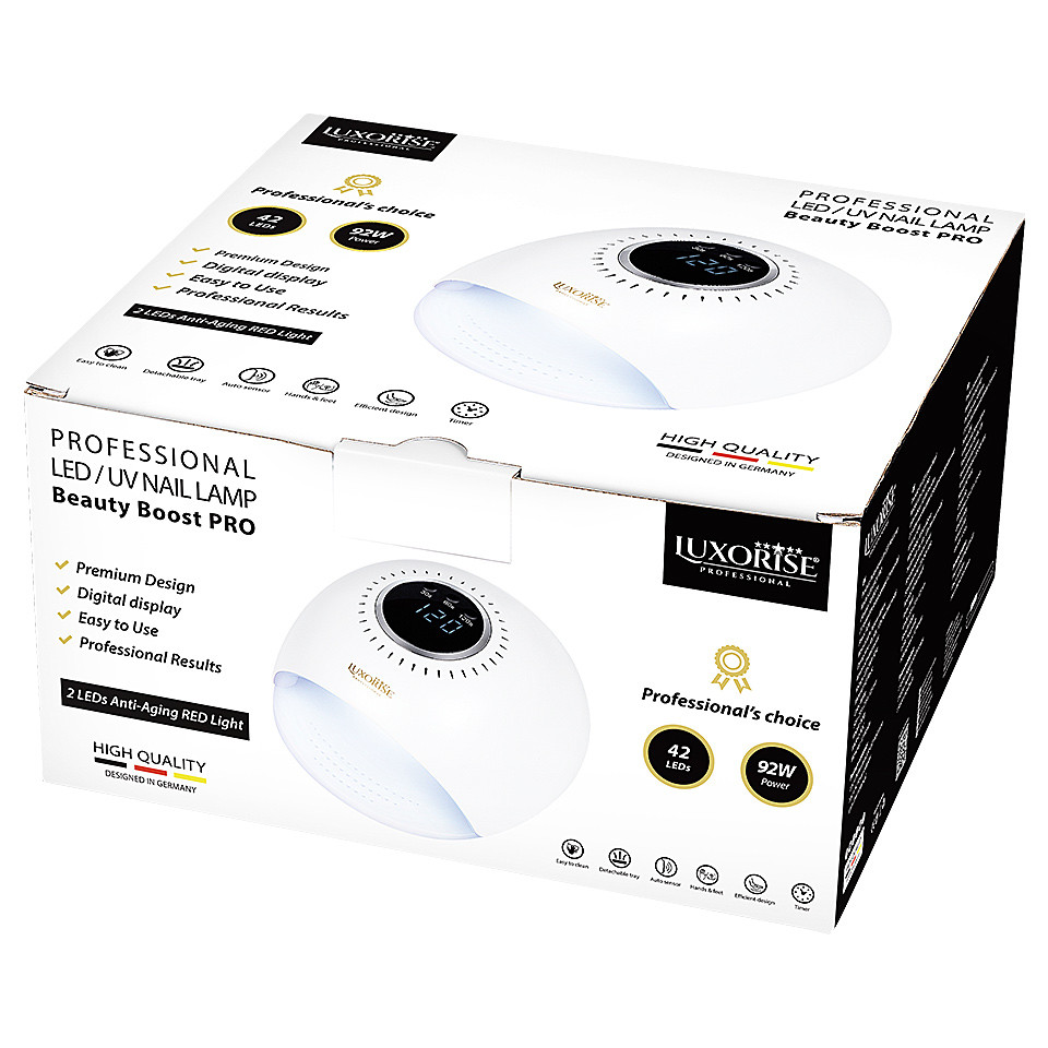 Lampa Unghii UV LED 92W Beauty Boost PRO – LUXORISE, Alb asigura o uscare ultra rapida si reprezinta cea mai noua inovatie in domeniul unghiilor tehnice, fiind dotata cu 4 LED-uri RED Light cu efect de Anti-Aging , display digital generos si senzor de miscare. Realizata din materiale de inalta calitate, la cele mai ridicate standarde, lampa Beauty Boost PRO este dotata cu 42 de LED-uri si are o putere de 92W. Lampa este imbunatatita cu 4 LED-uri ce propaga lumina rosie. Fotonii raspanditi de lumina rosie intra in tesuturile subcutanate generand stimularea producerii de colagen. Aceasta ajuta la regenerarea celulelor, redand astfel elasticitatea pielii si hidratand-o. Aparatul de ultima generatie asigura polimerizarea rapida si uniforma a ojei semipermanente si a tuturor gelurilor UV. Ecranul digital LED va porni la alegerea unuia dintre cele 3 programe de timp disponibile: 30s, 60s, 120s, (low heat mode). De asemenea, dispozitivul vine dotat si cu un senzor de miscare, care se va activa automat atunci cand mana sau piciorul sunt introduse. Specificatii tehnice: – Ecran digital cu 3 programe de timer – 50,000 ore durata de viata (11,4 ani daca este folosita 12 ore pe zi) – Putere: 92W – 42 de LED-uri – Timp de uscare: 30s, 60s, 120s, (low heat mode) – Senzor de miscare – Baza detasabila – Dimensiune: 23 x 20,5 x 11,5 cm – Greutate: 483 g – Culoare: Alb – Garantie: 12 luni Model: LUX-U92X PRO Pachetul contine: – Lampa unghii UV LED Beauty Boost PRO LUXORISE – Incarcator – Manual de utilizare