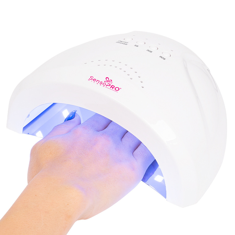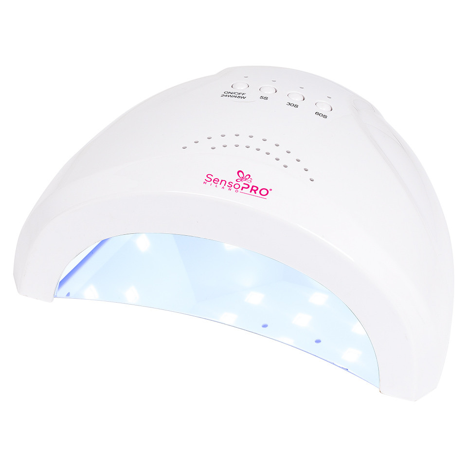 Lampa UV LED 48W SUNONE SensoPRO Milano, culoare alb este o lampa de calitate Premium cu 30 LED-uri dotate cu tehnologia Double Light Source. Este un aparat de ultima tehnologie ce garanteaza o uscare rapida pentru orice tip de Gel UV si Oja Semipermanenta, cu un consum minim de energie. Aceasta nu produce caldura si este potrivita atat pentru manichiura, cat si pentru pedichiura. Datorita tehnologiei inovative, LED-urile nu sunt daunatoare organismului. Lampa UV LED 48W SUNONE SensoPRO Italia, White are un design inedit, fiind realizata la cele mai inalte standarde. Aparatul este dotat cu senzor de prezenta astfel ca atunci cand introduci mana in lampa ea porneste automat si functioneaza timp de 60 secunde. O alta modalitate de pornire a lampii este prin apasarea butonului On/Off. Apasati butonul On/Off timp de 2 secunde pentru a comuta intre 24W si 48W (LED-ul de power sta aprins cand este selectat 24W). Specificatii: – Lampa UV LED SUNONE SensoPRO are 30 LED-uri – Putere maxima: 48W – Model: SP- 48SUN – Tensiune alimentare 220-240V 50 Hz – Lungime de unda: 365+405nm – Lampa UV LED SensoPRO prezinta 50,000 ore durata de viata (11,4 ani daca este folosita 12 ore pe zi) – Senzor activat la miscare – Dimensiuni: 19 x 15 x 8.5 cm – Greutate : 342 g – Material: HQ Plastic – Culoare: alb Pachetul contine : – 1 x Lampa LED UV – 1 x incarcator priza – 1 x manual de utilizare GARANTIE 12 LUNI