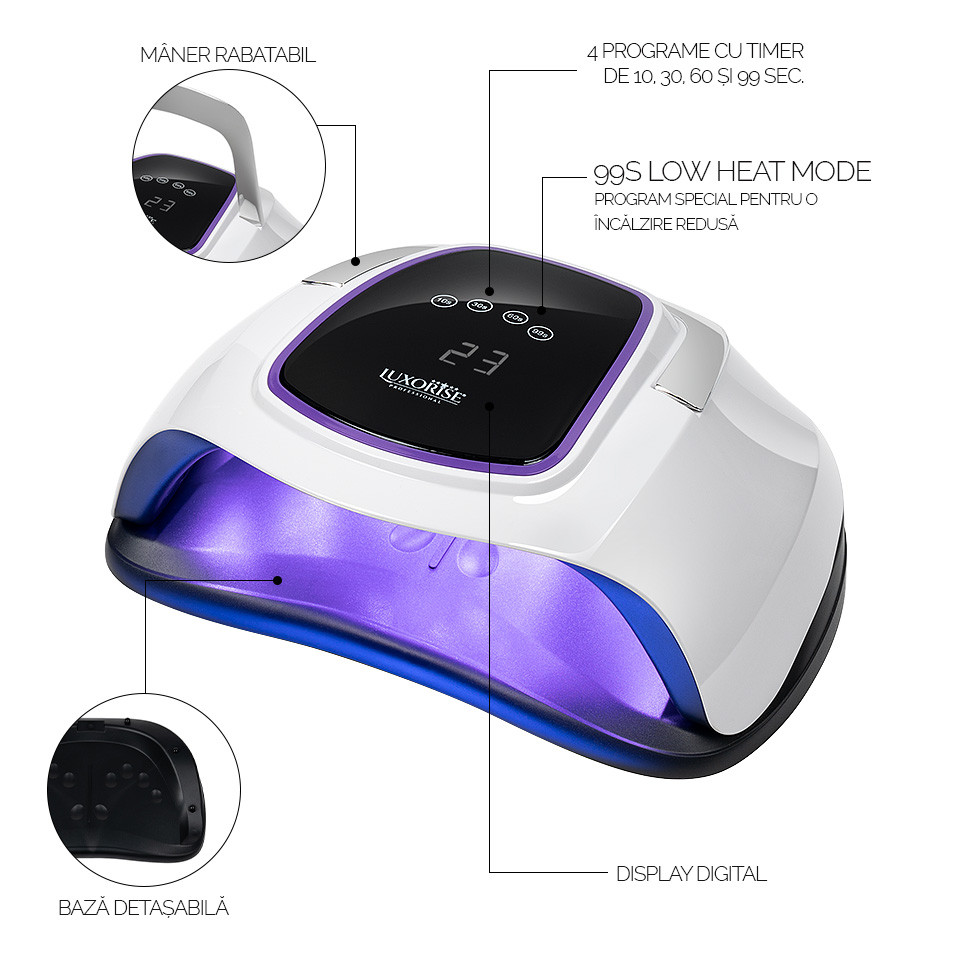 Lampa UV LED pentru doua maini 108W STAR X PRO – LUXORISE, Mauve este potrivita pentru uscarea oricarui tip de gel sau oja semipermanenta. Aceasta lampa este potrivita pentru a polimeriza manichiura la ambele maini simultan, eficientizand procesul. Astfel, vei obtine manichiura mult dorita intr-un timp mult mai scurt, cu maximum de rapiditate si precizie. STAR X PRO are un design performant ce dispune de un display generos, butoane touch si 4 programe de uscare a ojei. De asemenea, datorita bazei detasabile, lampa STAR X PRO este potrivita atat pentru manichiuri cat si pentru pedichiuri. Lampa UV este dotata cu timer de 10, 30, 60 si 99 de secunde (low heat mode), 36 de LED-uri ce sunt pozitionate ideal pentru uscarea uniforma a ojei semipermanente sau a gelului. Specificatii tehnice: – 36 LED-uri – Model: LUX-108SX PRO – Putere: 108W – Culoare: Mauve – Tensiune: 220-240V 50Hz – Dimensiune: 28 x 22.6 x 11.8 cm – Greutate: 703 g – Timer: 10, 30, 60, 99 secunde – Functionare: 50.000 ore – Garantie: 12 luni Pachetul contine: – 1 buc x Lampa unghii UV – 1 buc x Incarcator – 1 buc x Manual de utilizare