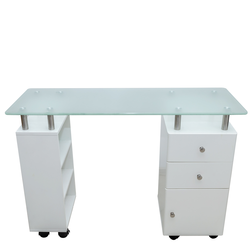 Blatul de sticla este usor de curatat si intretinut, iar suportul pentru mana asigura confortul clientului in timpul manichiurii. Cele doua dulapuri ofera spatiu suficient pentru depozitarea produselor si aparaturii necesare pentru realizarea manichiurilor si pedichiurilor.