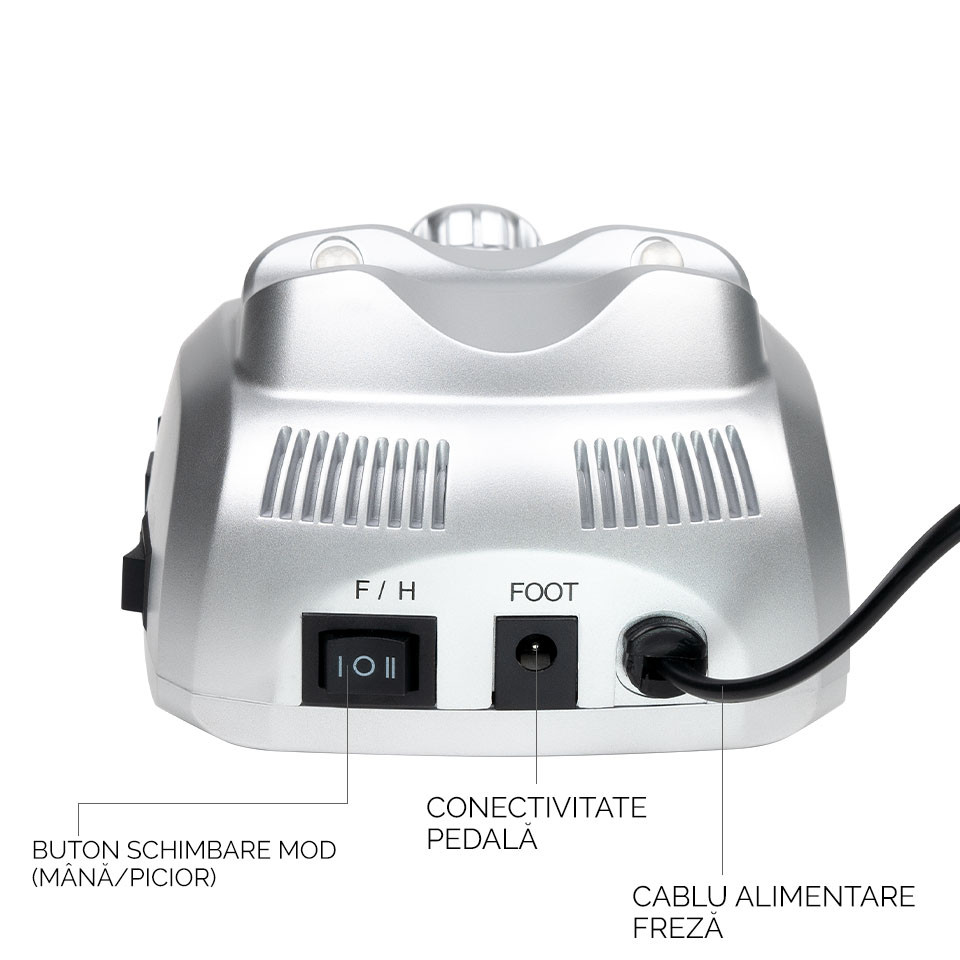 Pila Electrica Profesionala PowerPRO Ultra – LUXORISE Germania este o pila electrica puternica (30.000 RPM), pentru manichiura si pedichiura. Recomandata saloanelor de infrumusetare si tehnicienilor de unghii. Unitatea centrala cu design modern este realizata din materiale de calitate. In plus, mandrina cu elemente metalice este robusta si usor de utilizat. Pila implineste rapid si cu rezultate optime urmatoarele operatiuni: pilire, slefuire, polizare, ascutire, lustruire si crearea patului unghial. Este dotata cu sistem de control al vitezei. Tehnicianul poate alege cu usurinta viteza de lucru cu ajutorul butonului de reglaj. Are protectie la suprasarcina si oprire de siguranta. Mandrina puternica a acestei pile electrice lucreaza silentios, fara vibratii. Pentru un mai mare confort, pila electrica poate fi actionata cu ajutorul pedalei incluse. Pachetul contine: o pila electrica profesionala, mandrina, pedala, 6 varfuri de polizare, 6 capete de slefuit, un manual de utilizare. Sfaturi utile pentru o folosire indelungata: Cand freza nu este folosita, aveti grija ca aceasta sa fie oprita de la butornul OFF. Nu este suficient ca modul de lucru sa fie dat la 0. Pentru fiecare schimbare a sensului de rotatie setati mai intai viteza de rotatie la 0 apoi apasati butonul de Reverse / Forward. Nu apasati butonul de Reverse / Forward in timpul functionarii. Exista riscul ca mandrina sa se arda. Specificatii tehnice: Viteza: 30.000 RPM Putere: 30 W Culoare: Argintiu Dimensiune: 11,8 x 15,5 x 7,1 Cod produs: LUX-3800 PRO Sens rotatie FWD / REV Pachetul contine: – freza electrica – set de capete freza – pedala – suport pentru mandrina – instructiuni de utilizare