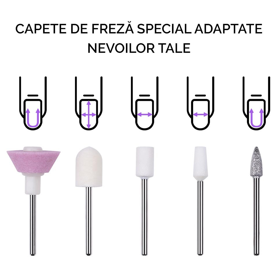 Set 5 Capete Freza Unghii SensoPRO Milano contine bituri imbunatatite cu pudra de diamant, fiind special create pentru orice pila electrica. Cele 5 capete sunt folosite pentru polizare si se potrivesc atat manichiurii, cat si pedichiurii. Formele diferite permit efectuarea mai multor operatiuni, printre care indepartarea vechiului start de oja/gel/acyl, stilizarea cuticulei, etc. Cele 5 capete freza manichiura sunt compatibile cu orice tip de freza electrica. Proprietati: – Rezistenta indelungata – Potrivita pentru ambele sensuri de rotatie ale frezei electrice de unghii – Indepartare gel sau acryl de pe unghii – Stilizarea cuticulelor – Pregatire si nivelare unghii naturale – Curatare usoara – Ideal pentru matuirea suprafetei unghiei – Destinat pentru uz profesional