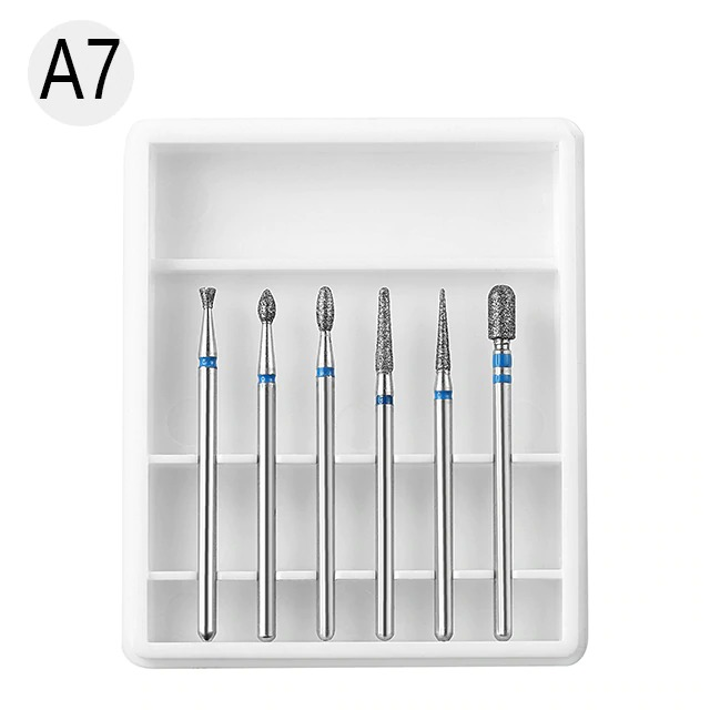 SET 6 CAPETE PENTRU FREZA UNGHII ALB – A7 – sunt folosite pentru polizare si pot fi folosite atat la manichiuri, cat si la pedichiuri. Formele diferite permit efectuarea mai multor operatiuni de stilizare a unghiilor. Specificatii: – sunt cele mai performante datorita felului unic de productie, ele fiind construite dintr-o singura bucata de Tungsten Carbid; – Sunt foarte populare in toata Europa si SUA gratie calitatii superioare; – Aceste capete de freza sunt ideale pentru indepartarea straturilor vechi de gel, acrilicului sau oja, modificarea si ingrijirea unghiilor naturale, a cuticulei si a pielii intarite; – Cea mai importanta caracteristica a acestor capete de freza este ca sunt singurele care au 0,01 mm vibratii in timpul functionarii. Aceasta proprietate se traduce printr-o utilizare foarte usoara din partea protezistului / manichiuristei; – Tungsten carbidul este cel mai rezistent material pentru plirea unghiilor; – Designul unic, permite aerisirea marginilor in timpul pilirii pentru a nu incinge unghia si de aici reducerea semnificativa a disconfortului creat daca s-ar fi folosit o freza clasica.
